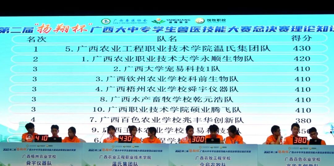 11月,2025年第二届“扬翔杯”广西大中专学生兽医技能大赛总决赛圆满落幕。我校代表队在比赛中表现卓越,由动物科技学院苏乾莲、李兰升、黄雪英3位指导老师带领的参赛团队荣获团体一等奖;参赛队员兰雪艳斩获个人特等奖,姚倩宁、韦景然夺得个人一等奖,充分展现了我校兽医专业人才培养的丰硕成果。