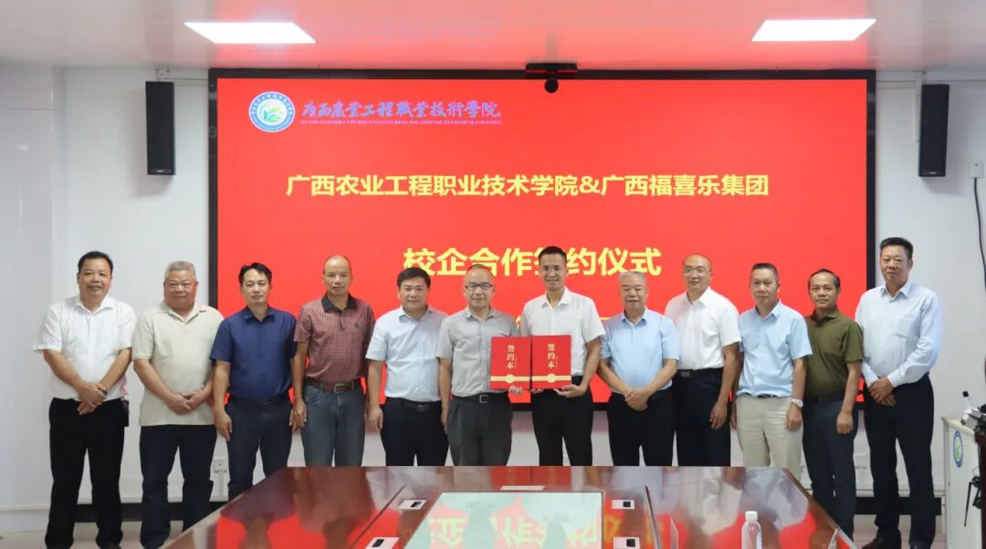 随后,在校企双方共同见证下,李祖培副校长与广西福喜乐集团总裁刘国华分别代表校企双方签署合作协议。