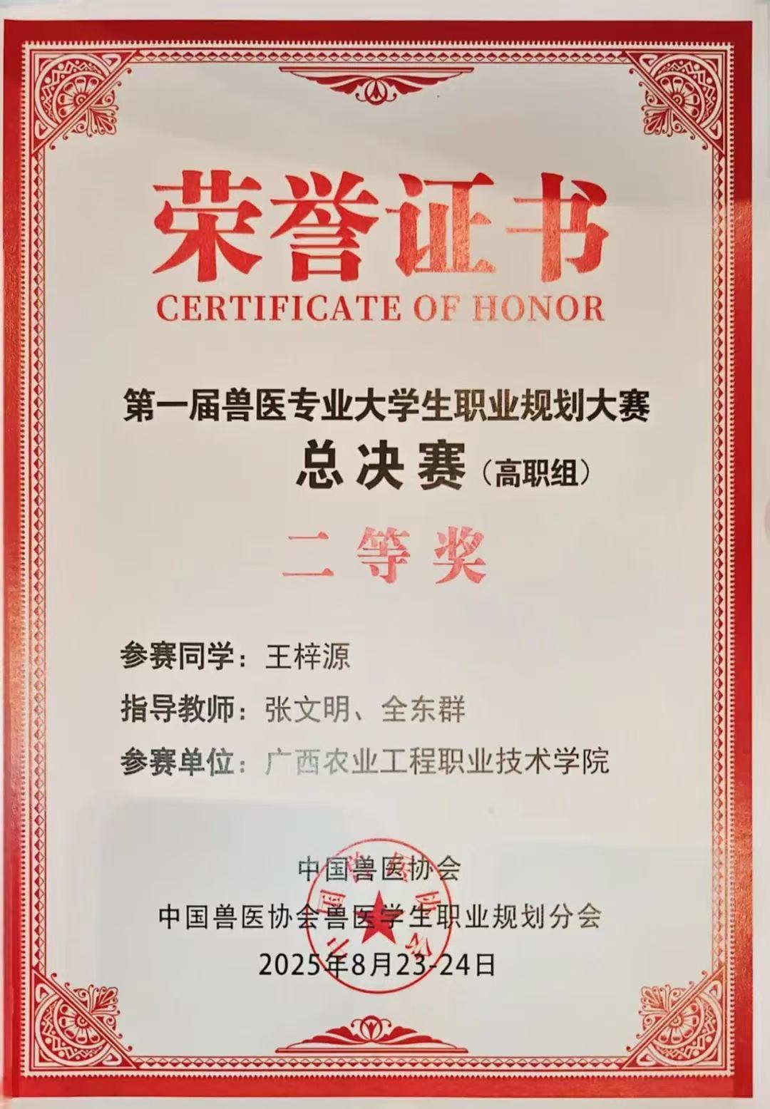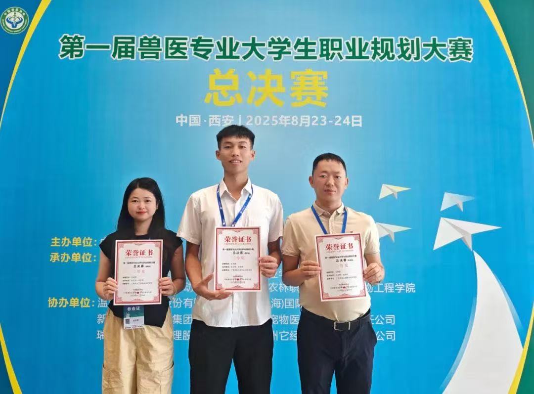 8月23日至24日,由中国兽医协会主办的首届全国兽医专业大学生职业规划大赛总决赛在西安国际会展中心隆重举行。我校2023级畜牧兽医专业王梓源同学,在张文明、全东群两位教师的专业指导下,以“精进兽医技术,守护猪群健康”为主题进行汇报展示,凭借出色表现荣获高职组二等奖。