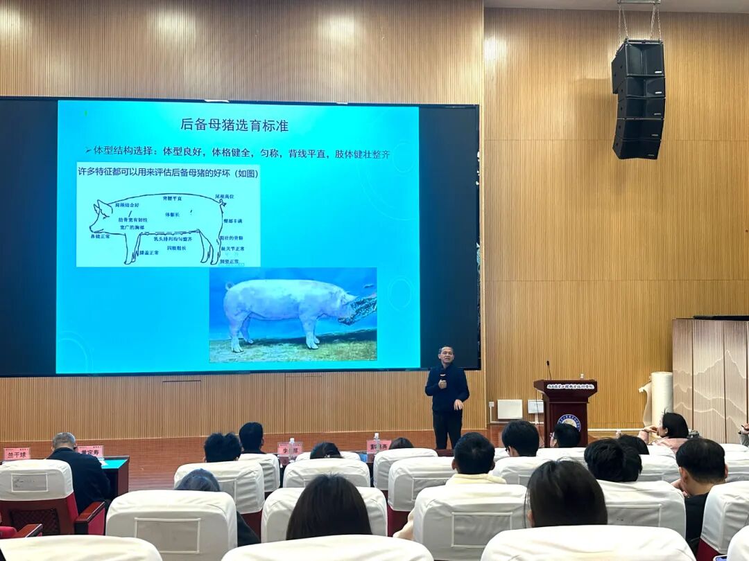 兰干球教授在仪式上讲授“福林养猪班”第一课——《种猪选择与培育》知识内容,为学员们开启“福林养猪班”学习的第一篇章。