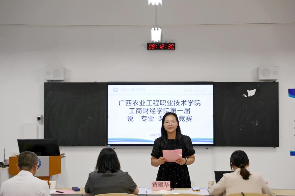 工商财经学院负责人黄丽华发表赛前讲话。她表示此次比赛具有重要意义,希望能够通过竞赛促进专业与课程建设,提高人才培养质量,以赛促教,以赛促改,在相互交流学习中提升教学质量。