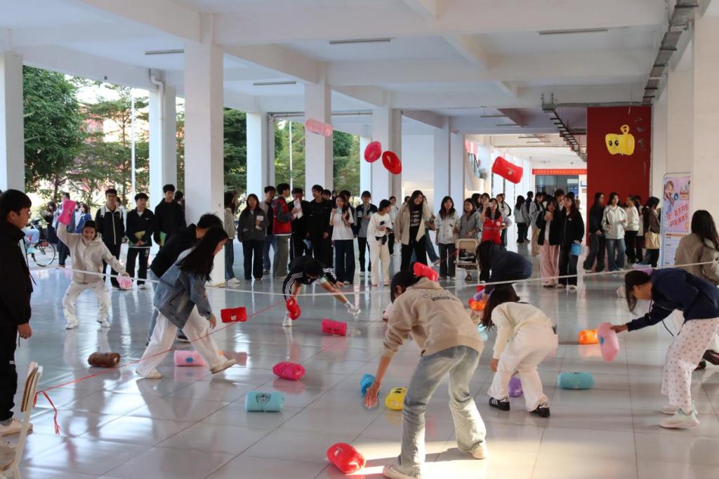 活动现场设置了丰富多样的活动体验环节,为学生释放情绪、感受温暖提供了重要载体,在学院一楼外长廊的趣味游戏区,“枕”救不开心、吹走烦心事、字词传温情等互动游戏热闹开展,同学们通过合理释放负面情绪的方式感受集体支持,增强信任感与凝聚力;在“烦恼清零计划”中建立“主动调控情绪”的心理暗示,培养耐心与情绪管理能力;在“心灵默契环”中以传递互动为形式探索人际认知之旅,跳跃的身影与欢快的笑声交织,同学们在团队协作中拉近了彼此的距离,让压力在运动中悄然释放。