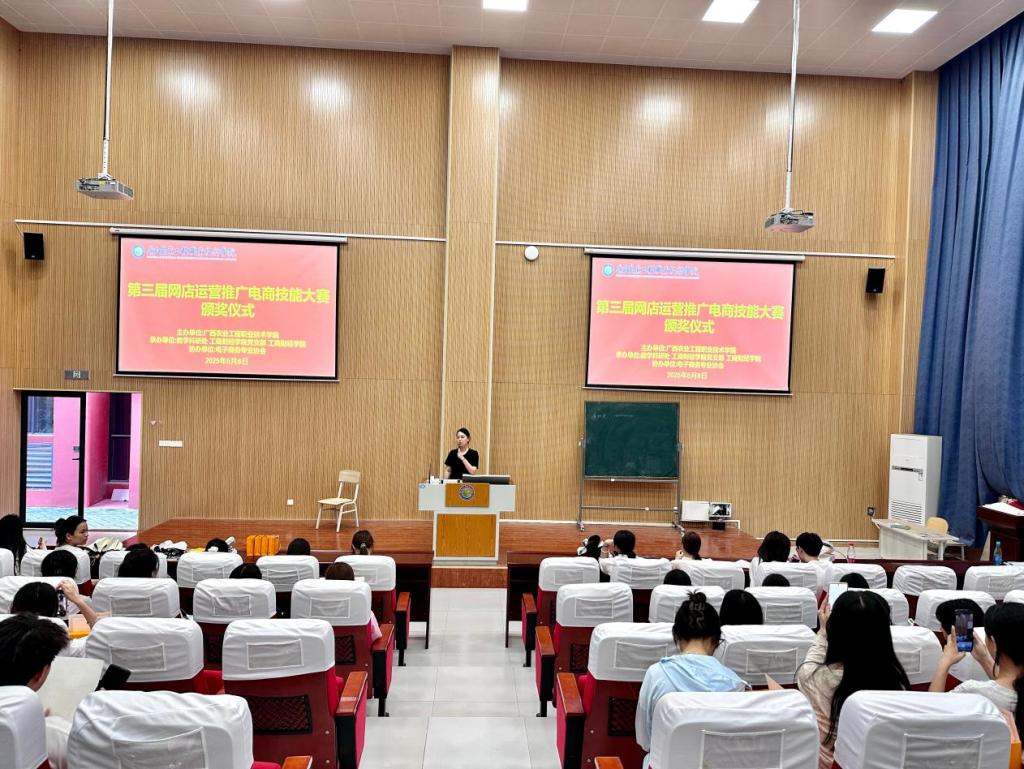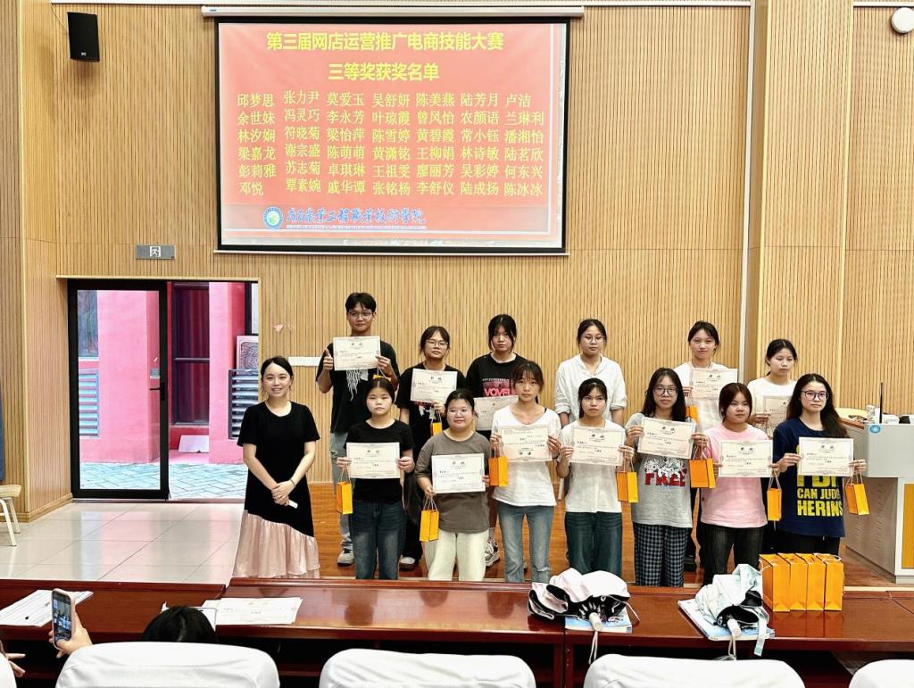 2025年5月8日,第三届网店运营推广电商技能大赛颁奖仪式在三号阶梯教室顺利举行。本次大赛共有14名同学荣获一等奖,28名同学荣获,42名同学荣获三等奖,53名同学荣获优秀奖。为所有参赛选手搭建了一个展示自我、收获荣耀的舞台。大赛由共青团广西农业工程职业技术学院委员会主办,电子商务协会承办,由电子商务专业负责人、电子商务专业协会指导老师吴慧珍为同学们颁奖。