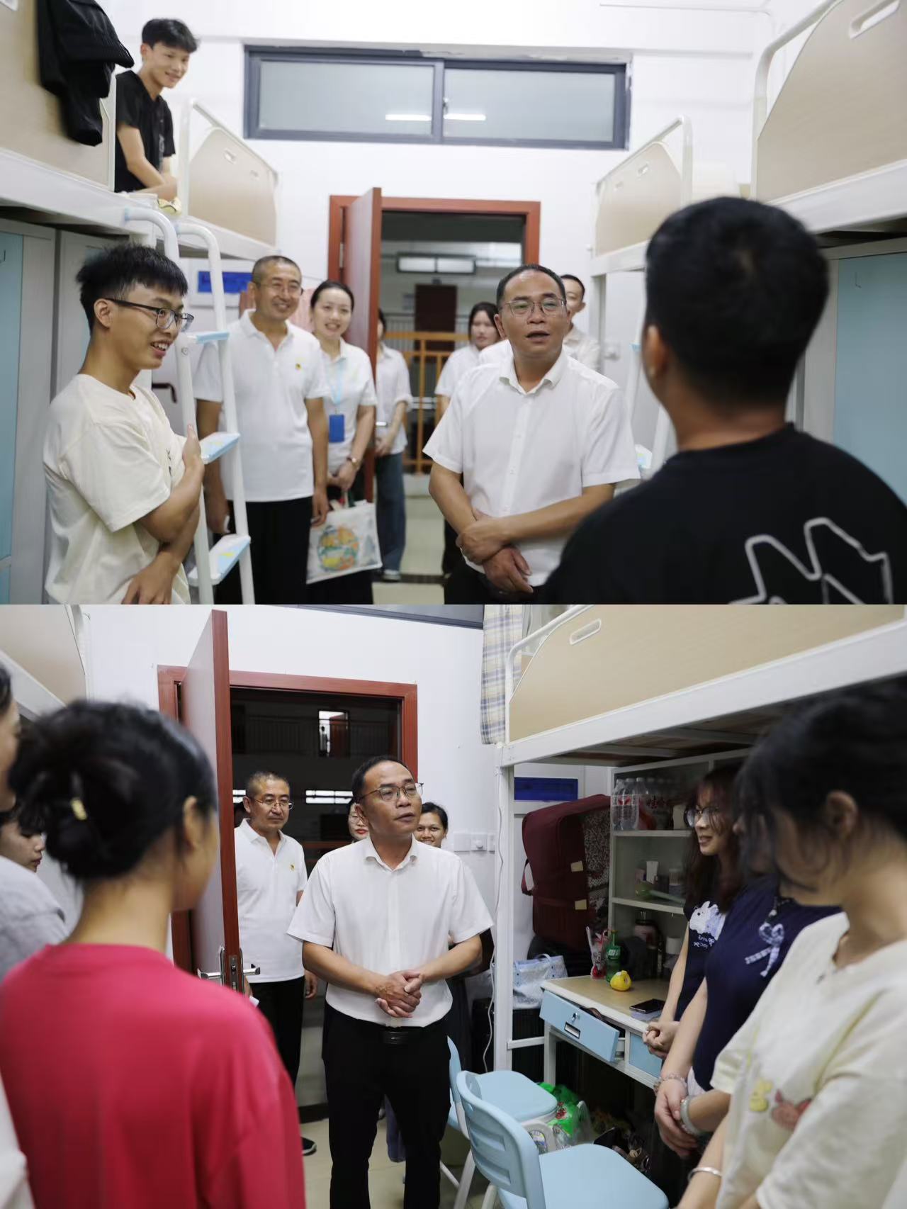 华灯初上,夜幕降临,迎新日的忙碌并未随着日暮而结束。晚上20时,学校总会计师韦炜率领学院领导班子、新生班主任及辅导员一行,深入新生宿舍楼,逐一走访慰问刚刚安顿下来的2025级新同学。每到一个寝室,学院领导都与新生和陪同的家长进行亲切交流,细致询问他们初到学校的感受,详细了解住宿、饮食等生活细节,耐心解答同学们提出的各种问题。充分体现了学院“以生为本”的工作理念和人文关怀,拉近了学院师生间的距离,增强了新生的归属感。