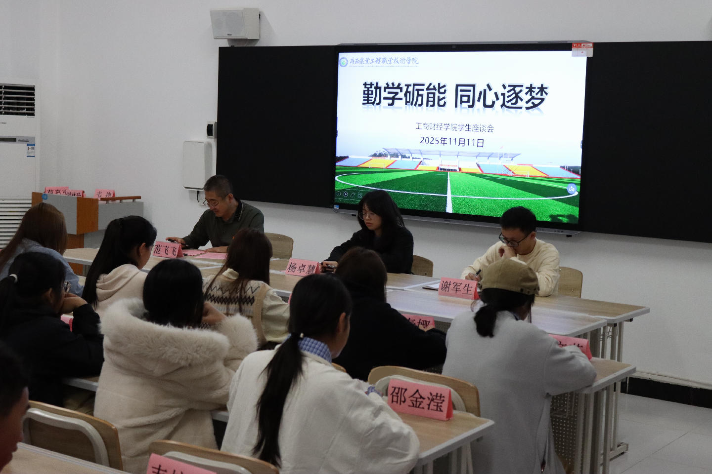 为深入了解学生的学习和生活情况,倾听学生的心声,更好地服务学生成长成才,2025年11月11日18:30,工商财经学院在4栋407会议室召开了主题为“勤学砺能·同心逐梦”的学生座谈会。工商财经学院副院长范飞飞、学工处代表杨卓慧、工商财经学院学生工作办公室干事谢军生、工商财经学院全体辅导员以及来自24、25级大数据与会计、电子商务、供应链运营专业的学生代表参加座谈会。