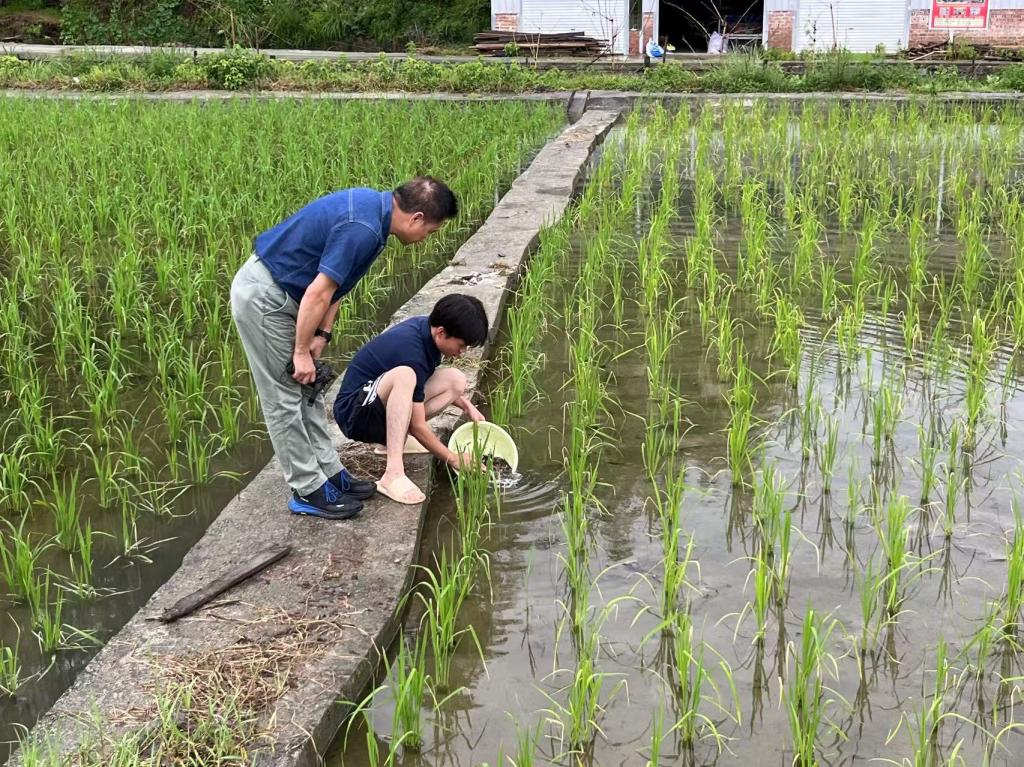 6月8日,团队奔赴三江县稻渔螺综合种养核心示范基地。这里,“稻+渔+螺”立体生态种养模式已具规模。基地负责人石红甲带领团队实地学习,从稻渔螺布局规划讲起,详解水稻品种选择、泥鳅投放时机、田螺生态调控作用等。团队成员深入田间,参与鳅苗投放等实践,亲身感受“一水三用、一田多收”的魅力。在调研交流中,石总分享了产业联农带农经验,通过“公司+基地+农户”模式,推广稻渔螺技术,助力村民增收。团队成员深受触动,意识到专业所学可深度赋能乡村产业,在生态种养与乡村振兴间搭建桥梁。