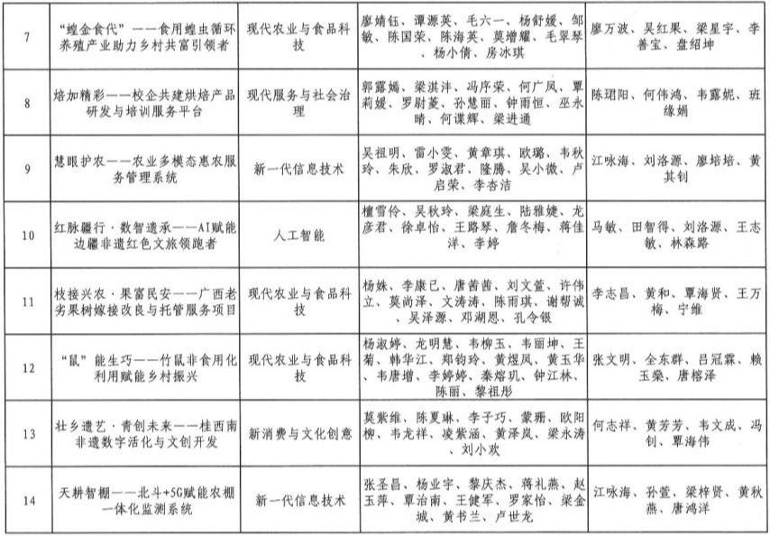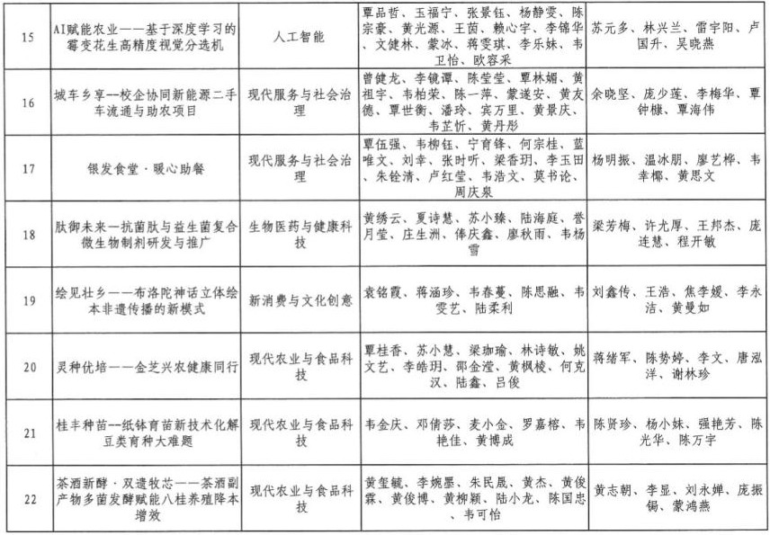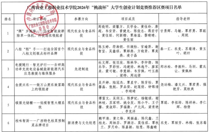 根据团区委下发《关于组织开展第十二届“挑战杯”广西大学生创业计划竞赛的预通知》文件要求,经过参赛队伍自主申报、初选赛和校赛评选、校团委审核,拟推荐《“踝”步越障——仿生智能旋耕除草一体机,科技助农领航者》等25项作品至自治区竞赛组委会,现将名单公示如下(见附件)。