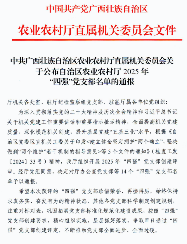 近日,中共广西壮族自治区农业农村厅直属机关委员会印发《关于公布自治区农业农村厅2025年“四强”党支部名单的通报》,机电工程学院党支部经过严格评审,凭借突出的党建工作实绩,成功获评自治区农业农村厅2025年“四强”党支部荣誉称号。