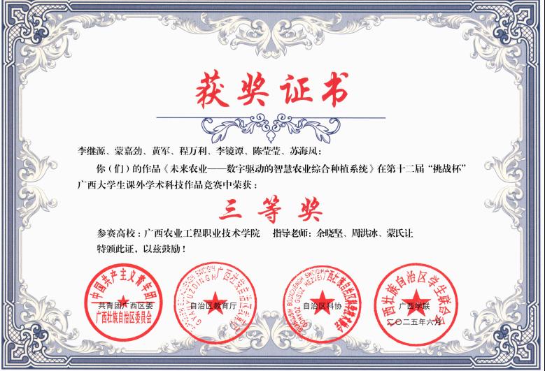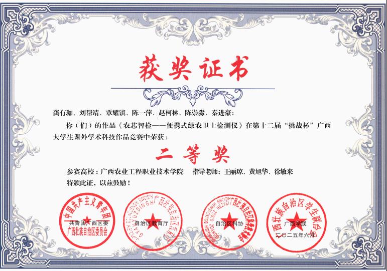 近日,第十二届 “挑战杯” 广西大学生课外学术科技作品竞赛获奖名单正式公布,我校以 25 项奖励、100% 获奖率的卓越成绩刷新历史纪录,其中一等奖 2 项、二等奖 7 项、三等奖 16 项,充分展现了我校学子的科创实力。