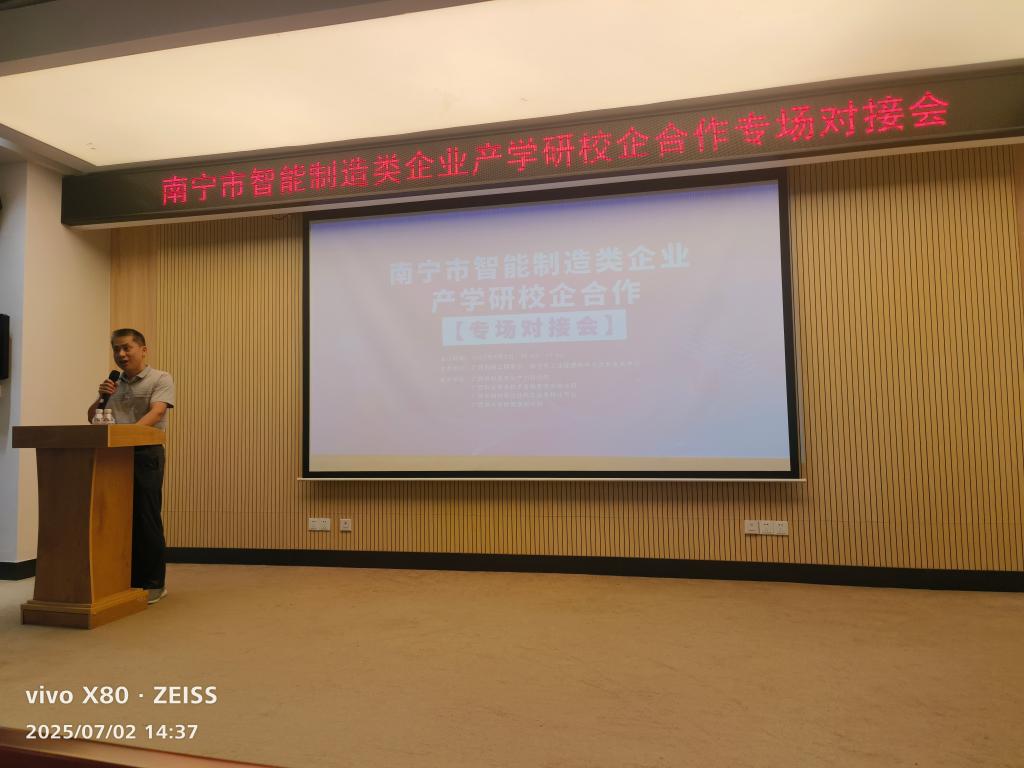 2025年7月2日,机电工程学院陈宏昌副院长与机电专业负责人苏元多老师赴南宁参加“智联产学研,赋能新制造”智能制造类企业产研学校企合作专场对接会。本次会议由广西机械工程学会、南宁市工业促进和中小企业服务中心联合主办,旨在搭建高效沟通桥梁,精准对接智能制造产业升级需求与高校人才、技术资源,吸引了16家知名智能制造企业积极参与。