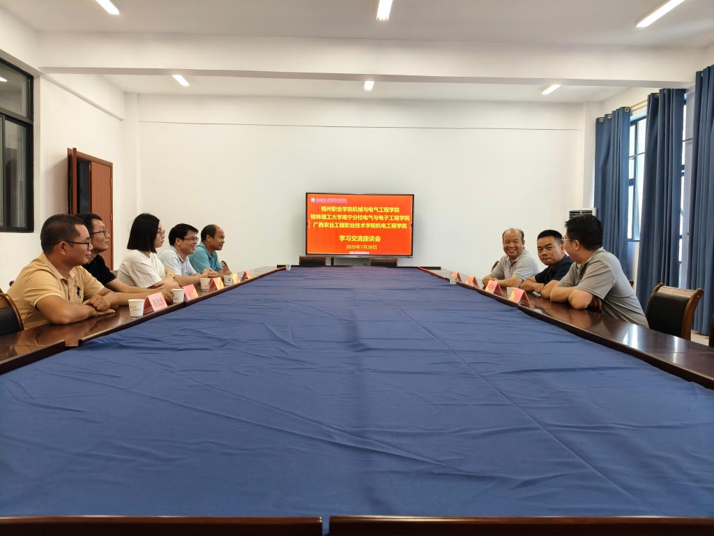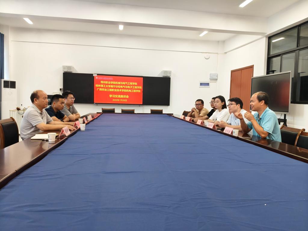 2025年7月28日,梧州职业学院机械与电气工程学院、桂林理工大学南宁分校电气与电子工程学院一行7人到访我校机电工程学院,围绕人才培养、专业设置、学生实习就业及产业学院建设等议题开展交流座谈。梧州职业学院方面,汽车教研室主任陆永结、产业学院教务科科长徐孟,以及汽车检测与维修技术、汽车制造与试验技术、汽车技术服务与营销三个专业的负责人赵天德、陈良忠、杨琳参与交流;桂林理工大学南宁分校则由电气与电子工程学院副院长李高宇、通信教研室主任韦义宏带队。我校机电工程学院副院长陈宏昌、新能源汽修专业负责人郑冰松出席座谈会。