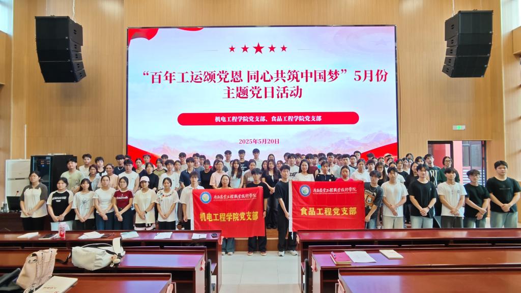 为深入学习贯彻党的二十大精神,践行习近平总书记关于工人阶级和工会工作的重要论述,2025年5月20日18:00-20:00,机电工程学院党支部与食品工程学院党支部在第8号阶梯教室联合开展“百年工运颂党恩 同心共筑中国梦”主题党日活动。两个支部的全体党员、发展对象和入党积极分子共80余人参加活动。