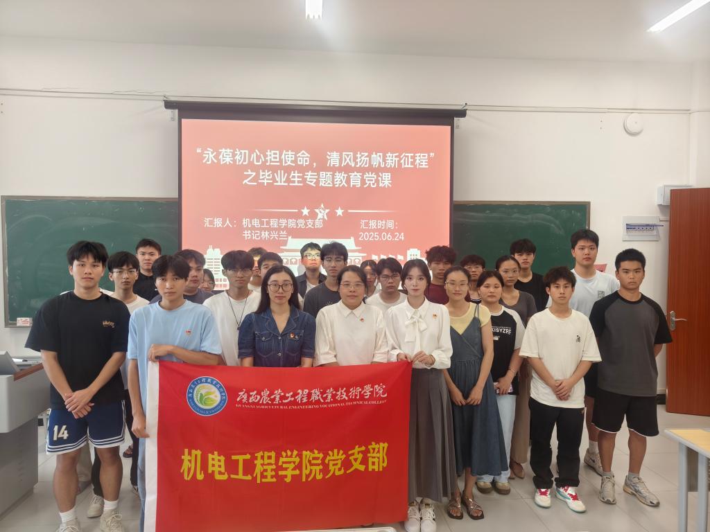 为强化毕业生党员理想信念教育,助力青年学子走好人生新征程,2025年6月24日中午,机电工程学院党支部在12栋教学楼510教室开展“永葆初心担使命 清风扬帆新征程”毕业生专题党课。本次党课由党支部书记林兴兰主讲,学院毕业生党员、发展对象及入党积极分子共同参与学习。