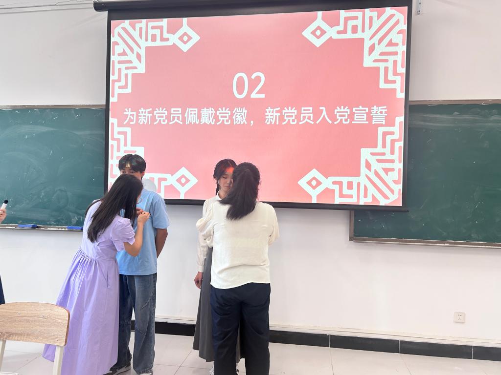 党课最后,庄重举行新党员党徽佩戴仪式,闪耀的党徽不仅承载着党员身份的荣耀,更凝聚着新时代青年的责任与使命。