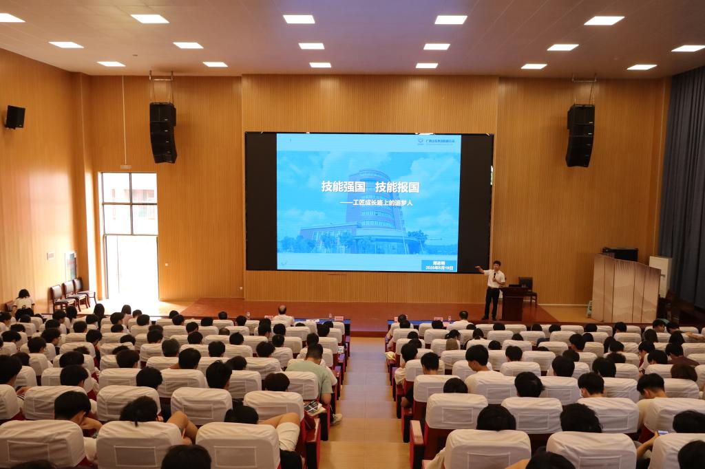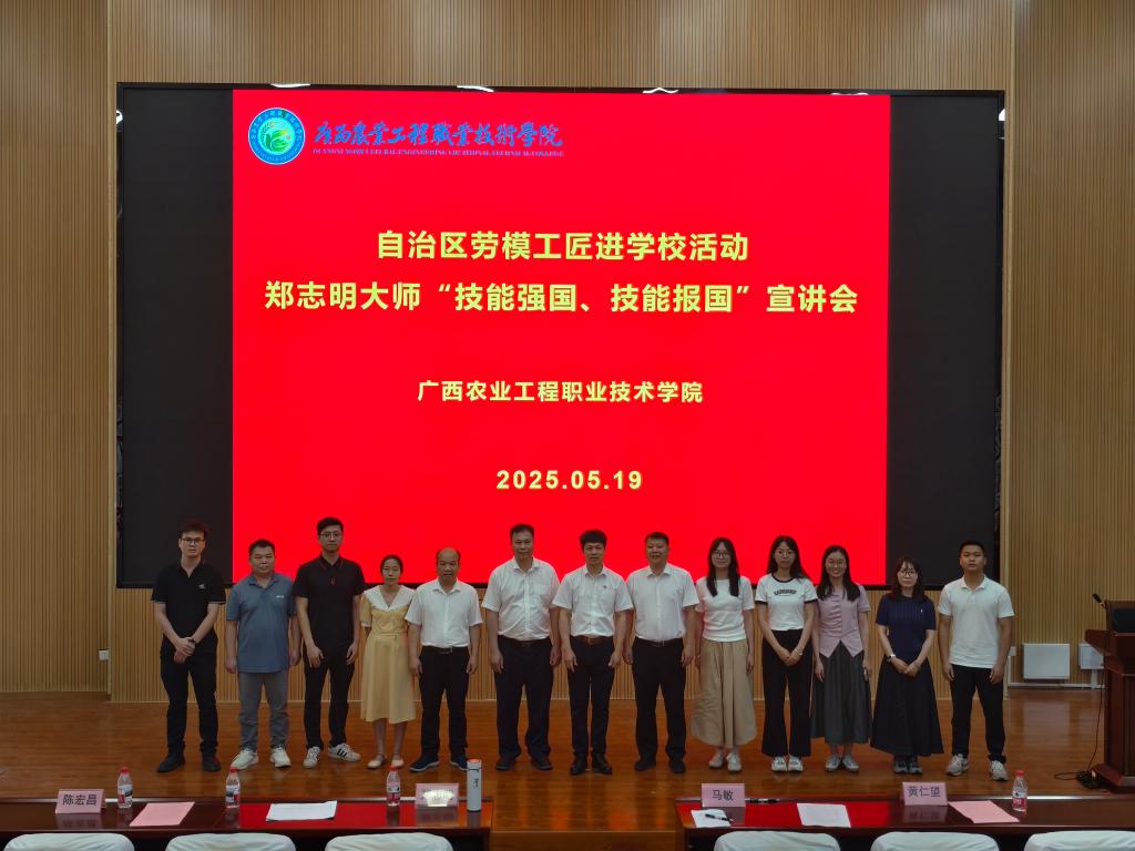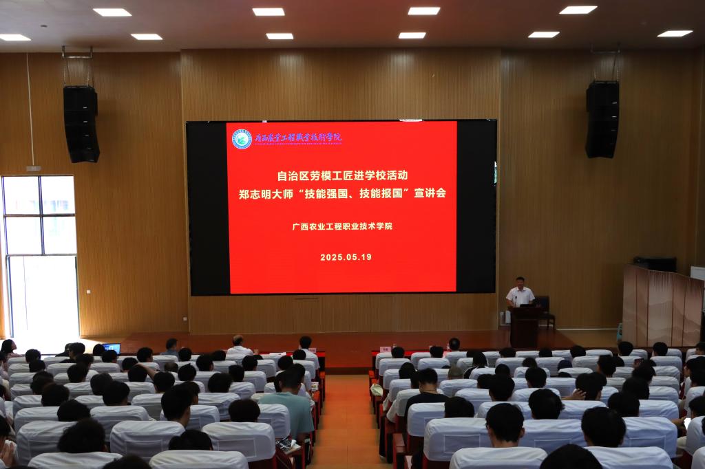 为弘扬工匠精神,激励青年学子走技能成才、技能报国之路, 5 月 19 日上午,我校在2号阶梯教室举办“技能强国、技能报国”专题报告会。党的二十大代表、全国劳动模范、广西首位“大国工匠”郑志明受邀作专题报告,学校党委书记马敏,党委副书记、纪委书记黄仁望出席会议。会议由马敏主持。
