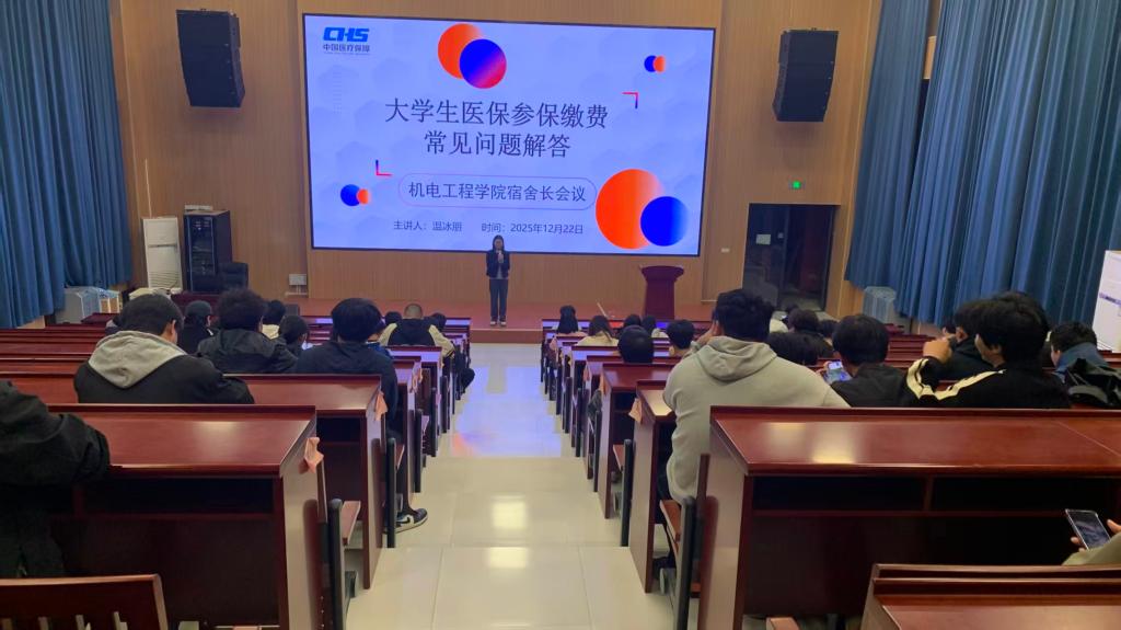 2025年12月22日晚,机电工程学院在8号阶梯教室组织召开城乡居民医保政策专题宣讲会,面向2024、2025级全体宿舍长进行大学生参保政策解读与参保指导。会议由学院辅导员温冰朋主持。
