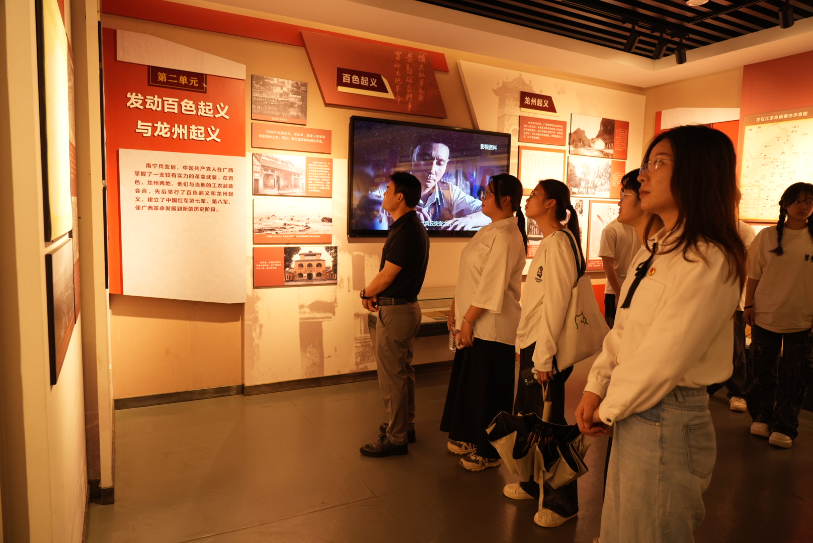 活动第四项内容,全体师生步行至李明瑞、韦拔群革命烈士纪念馆,进行自主参观学习。纪念馆内有“红色记忆”、“缅怀先烈”、“南宁市革命先驱”三部分内容,师生们通过珍贵的历史图片和实物,结合馆内文字解说,大家进一步了解了李明瑞、韦拔群等革命烈士的英勇事迹,深刻感受到了他们在艰苦卓绝的环境中所展现出的崇高信念和为国为民的高尚情怀。