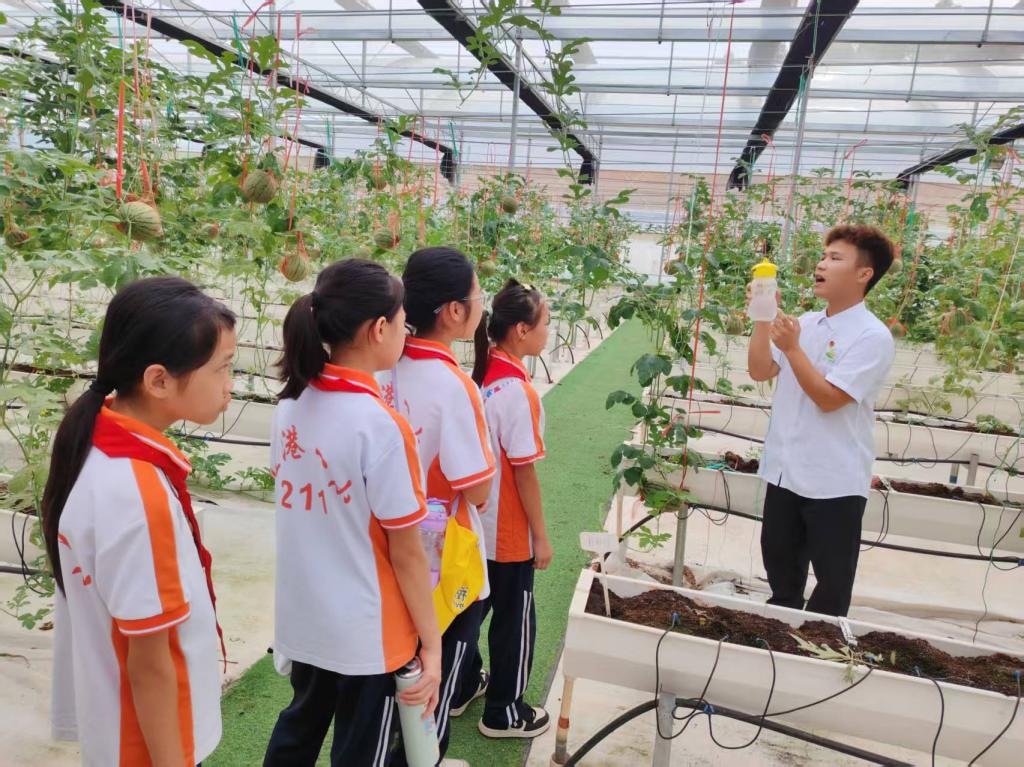 研学最后一站来到后山实训基地。在西瓜无土栽培大棚中,悬空生长的翠绿瓜蔓颠覆了孩子们对传统农业的认知。志愿者揭秘水肥一体化技术如何提升果实品质。走进反光地膜栽培豇豆防虫网棚,银色地膜映出粼粼光影,志愿者解释:“地膜反射阳光能驱虫,防虫网代替农药,这就是绿色农业!”孩子们亲手触摸地膜、观察豇豆藤蔓,在“田间实验室”感受科技对生态种植的赋能。