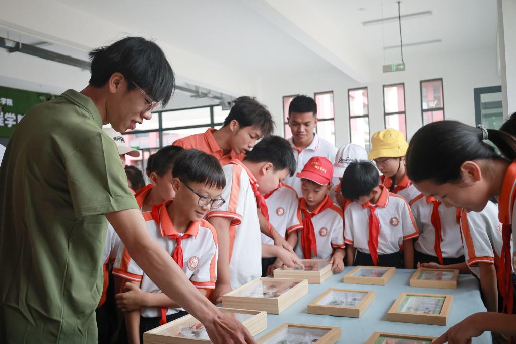 活动首站,小学生们跟随志愿者走进农生院8栋一楼植物工厂。层叠式LED光照栽培架、智能温控系统以及无土培育的蔬菜幼苗引发阵阵惊叹。小学生们边观察边记录,志愿者通过互动问答讲解“光配方”和营养液技术的奥秘。随后,众人移步连廊参观昆虫标本展,蝴蝶、甲虫、螳螂等数百件标本栩栩如生。志愿者以“昆虫王国历险记”为主题,讲述昆虫与生态的关系,孩子们透过放大镜观察昆虫翅膀纹理,感受大自然的奥妙。