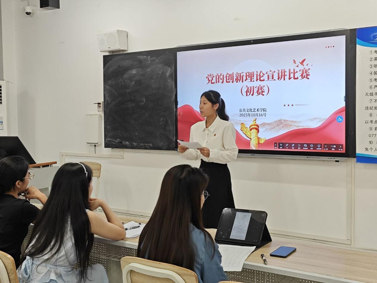为深入学习宣传贯彻党的创新理论,引导广大师生深刻领会其核心要义与实践要求,激发奋进新征程、建功新时代的磅礴力量,2025年10月16日晚上,公共文化艺术学院在3-205举行“党的创新理论宣讲比赛”二级学院海选活动。