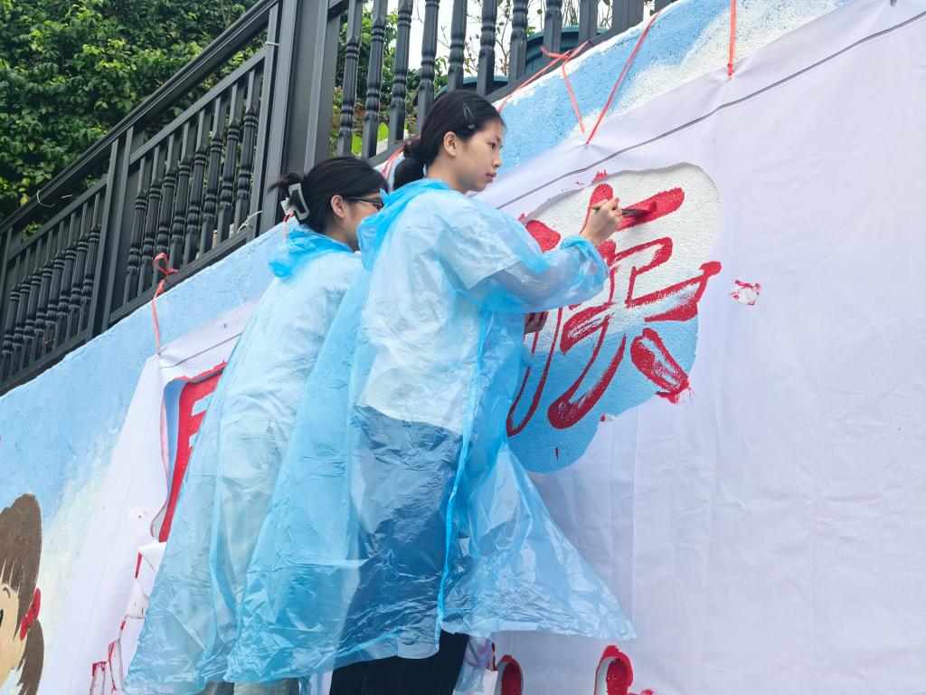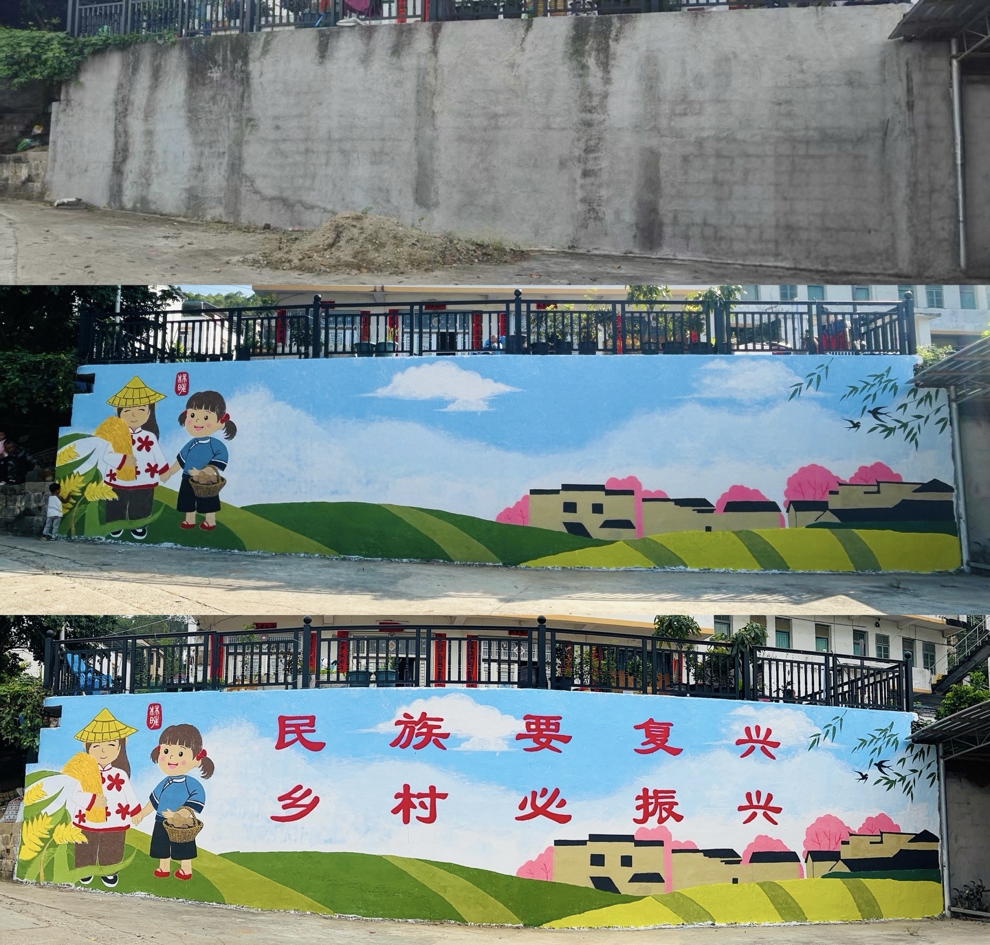 为完美呈现作品,支部成员二次前往,完成了最后的填色修整与主题字的书写。当“民族要复兴,乡村必振兴”这十二个遒劲有力的大字最终落成,整幅墙绘的艺术灵魂与时代精神交相辉映,将支部师生用艺术服务乡村、用画笔诠释担当的坚定信念,淋漓尽致地展现出来。