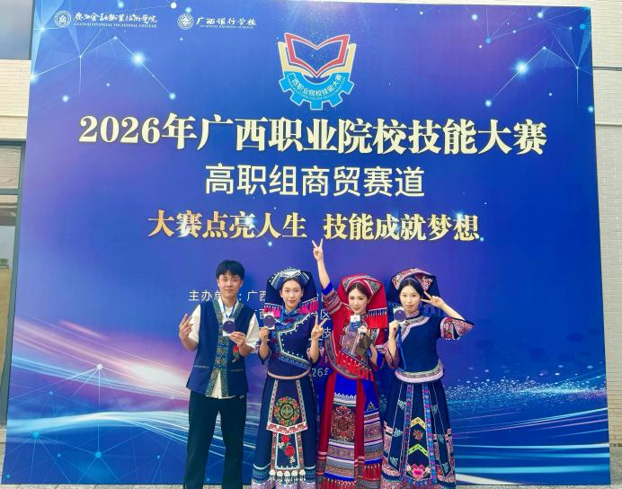 2026年3月16日,2026年广西职业院校技能大赛商贸赛道顺利收官,全区176支参赛队伍同台竞技、各展风采,竞争异常激烈。我院电子商务专业代表队不负使命、奋勇争先,在吴慧珍、罗芸芸两位指导老师的带领下,凭借过硬的专业素养、灵活的应变能力以及高效的团队协作,成功斩获金奖。
