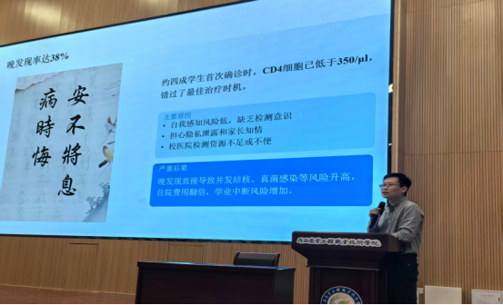 韦炜在讲座上致辞,对活动的组织者与授课专家表示感谢与欢迎。他指出,大学生正处于观念成熟与社交活跃的关键时期,掌握科学的防艾知识至关重要。他鼓励同学们珍惜学习机会,将知识内化于心、外化于行,争做防艾知识的宣传员。