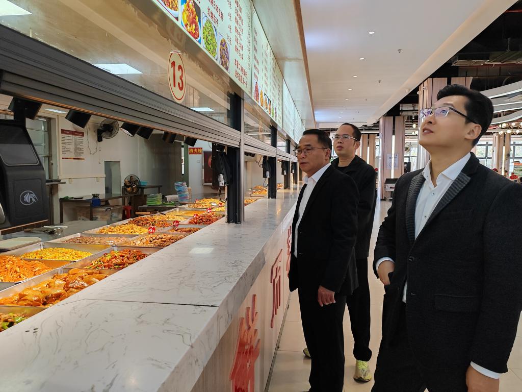 调研期间,梁钊丰书记一行实地走访了学校东苑餐厅一楼、二楼,重点检查了食材采购溯源、后厨操作规范、餐具消毒流程、食品留样制度及环境卫生管理等情况。在食材采购方面,梁钊丰书记详细询问了米面粮油、肉类蔬菜的进货渠道与质检流程,强调要严把“入口关”,杜绝不合格食材流入校园。在餐厅售卖窗口,梁钊丰书记驻足询问每日特色菜品价格,对比公示牌与实际售价,他强调要确保价格透明合理,让师生“吃得起、吃得好”。