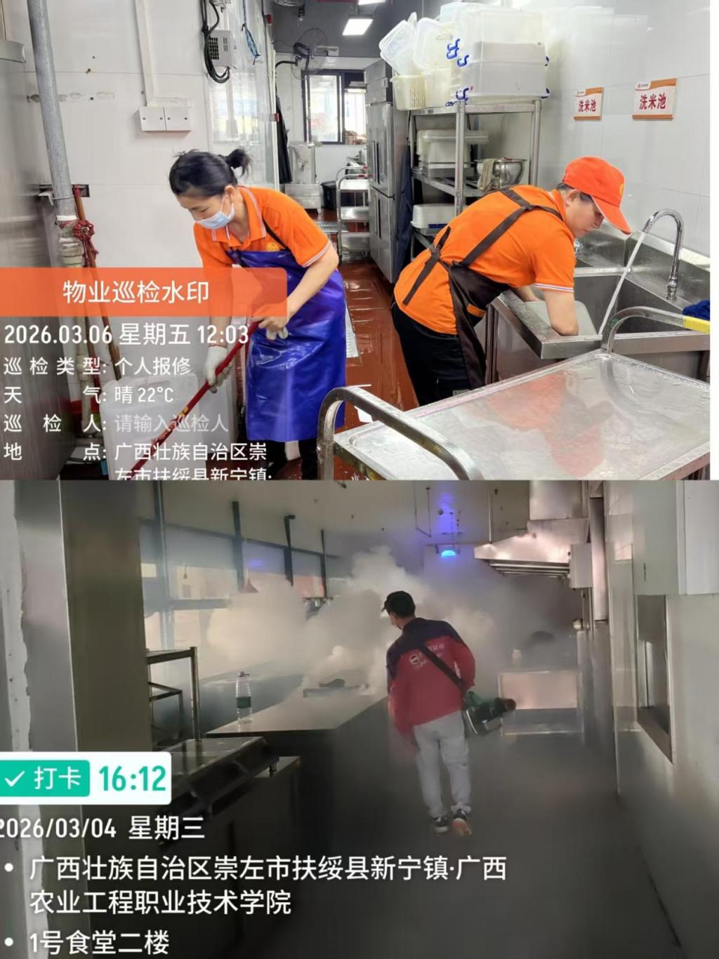 各食堂落实全方位卫生整治行动,后厨操作间、售卖区、就餐大厅及仓库均实施深度清洁,对设备设施、墙面地面进行无死角除尘除垢;同时委托专业机构开展病媒生物防治,封堵孔洞、清理积水,杜绝虫鼠滋生。通过"清洁-消毒-消杀"三重防护,全力打造安全、卫生、舒适的就餐环境,为师生健康保驾护航。