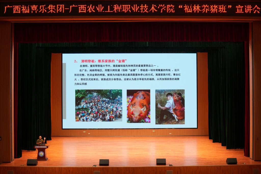 刘国华系统介绍了“福林养猪班”项目的背景意义、建设目标、实施路径及保障机制,展望了预期成果。他结合企业发展实际,从师资团队、企业文化、薪酬体系、晋升通道等方面展开分享,重点介绍了集团在各地布局的实习猪场资源,帮助学生直观了解未来的实习与就业环境。