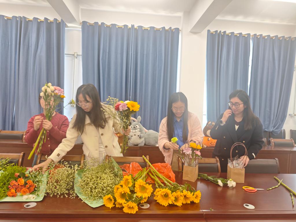 上午10时,活动在温馨的氛围中拉开帷幕。党支部宣传委员首先为大家简要介绍了插花艺术的基本知识,从花材选择、色彩搭配到造型设计,深入浅出地讲解激发了大家的创作热情。随后,女教师们纷纷动手实践,发挥个人创意,精心修剪花枝、构思层次,将一朵朵鲜花错落有致地插入花篮。活动现场花香四溢、欢声笑语,大家在繁忙的工作之余放松身心,感受艺术创作的乐趣。