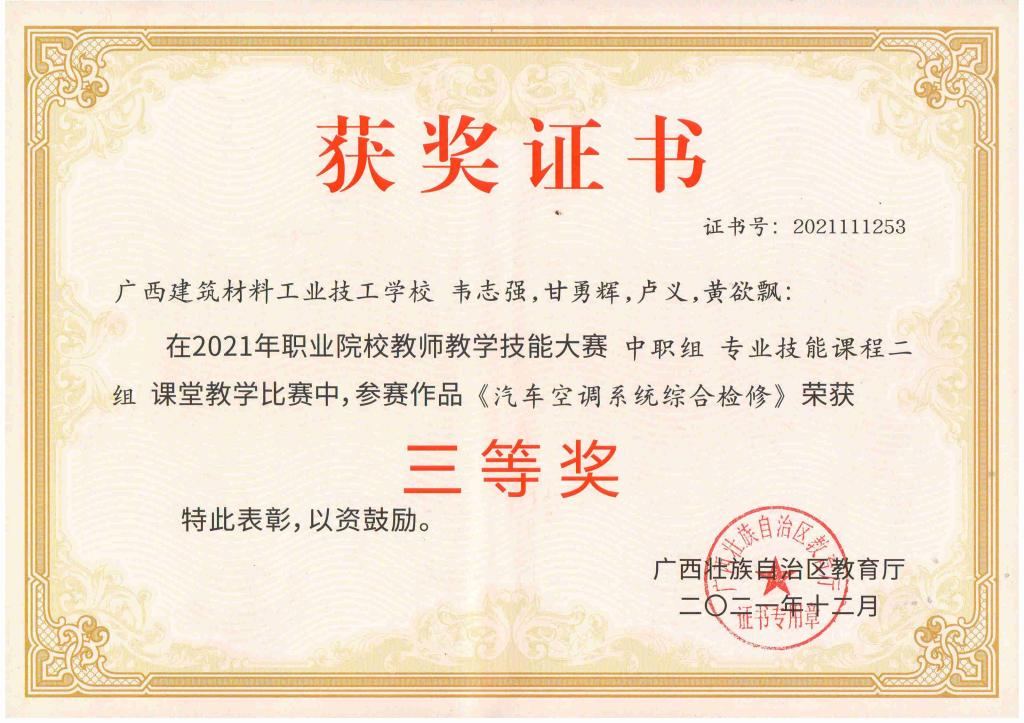 甘勇辉,汽车维修与检测技术专业专业带头人,研究生学历,副教授,广西职业技能竞赛(世赛项目)裁判员专家库专家,中级“双师型”教师,汽车维修高级技师,汽车维修工考评员,上汽通用五菱股份有限公司特聘校企合作教师。主持自治区科研项目6项并结题。出版专业教材13本,实用新型专利6项,发表论文14编。全区教师技能大赛荣获三等奖,指导学生技能大赛获国赛二等奖、三等奖各1项,自治区级一等奖2项,二等奖7项,三等奖5项。校级优秀成果二等奖1项,校级优秀教师称号,校级嘉奖一次。