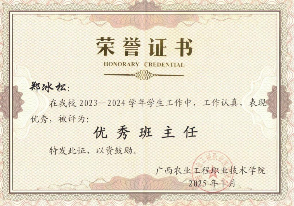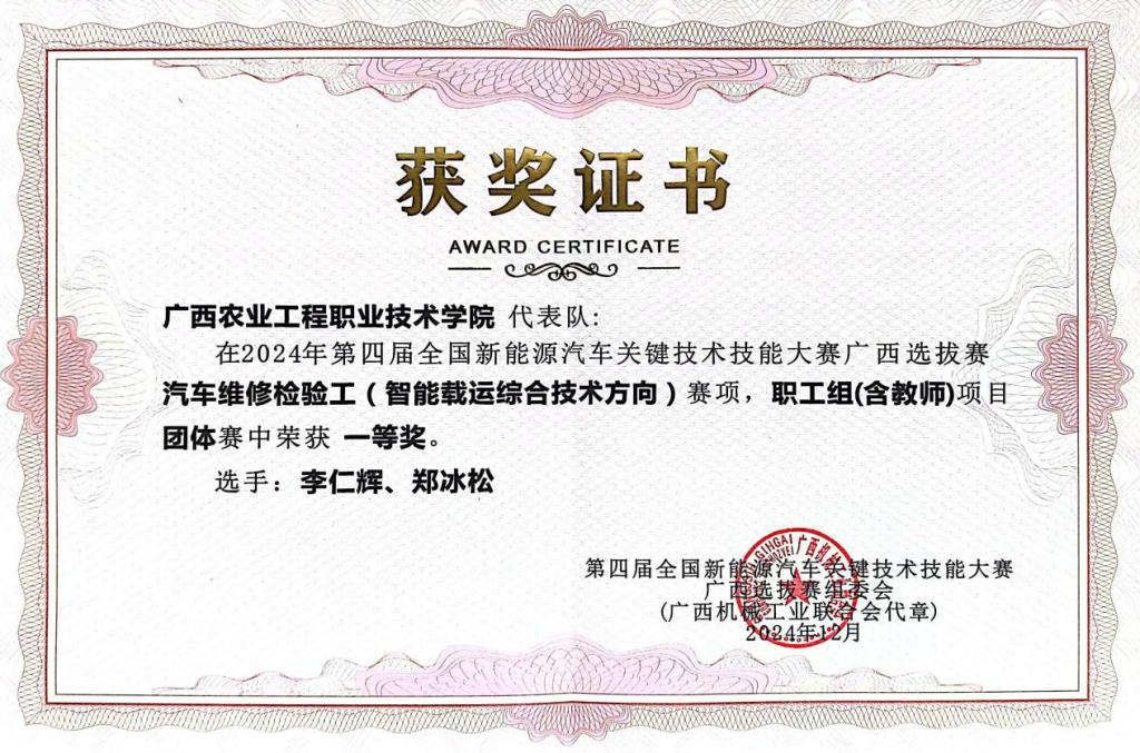 郑冰松,中共党员,高级工程师,机电工程学院副院长、新能源汽车专业负责人,广西技术能手。职业技能比赛国赛一等奖1项,省级一等奖1项和省级三等奖1项;指导学生技能比赛,获国家一等奖1项,三等奖1项,省级二等奖3项,三等奖6项;获学校2023年秋、2024年春、2024年秋学期教学质量优秀奖;获2023-2024年度优秀班主任,2025年度优秀教师;主持教改及科研项目3项,参与完成广西地方计量标准1项;发表论文8篇,获得实用新型专利3项,软著专利5项。