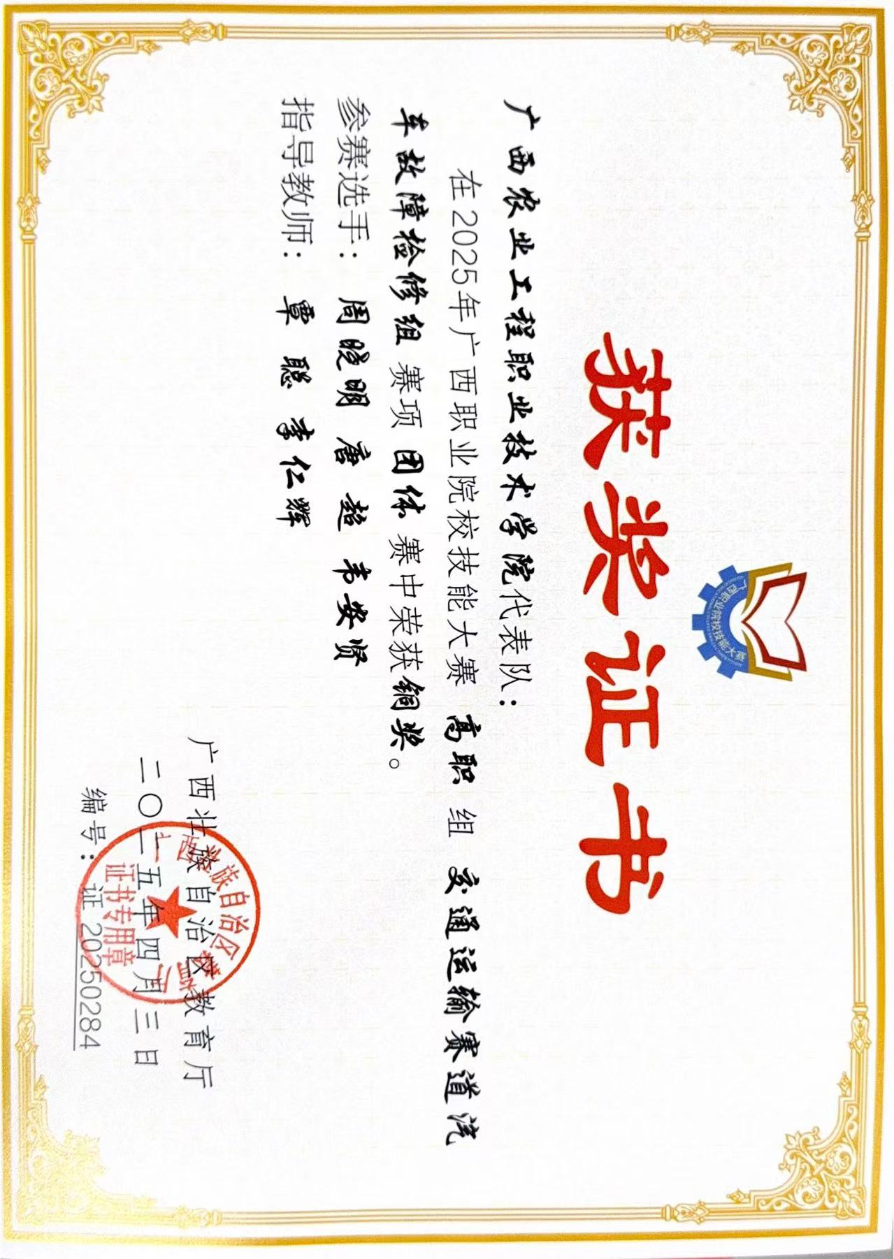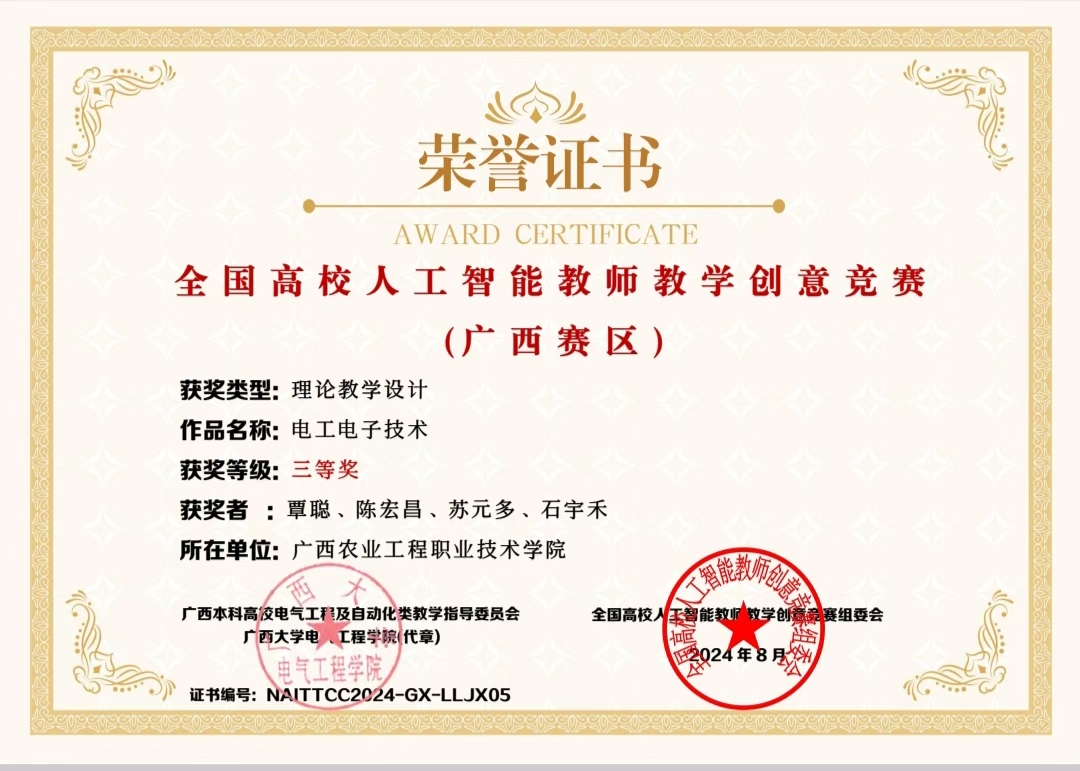 覃聪,中共党员,副教授,高级技师,高级“双师型”教师,广西农业工程职业技术学院学术带头人,机电一体化教研室主任,现代农业装备应用技术专业负责人,自治区直属机关优秀教师,自治区职业技能竞赛裁判员专家库成员。出版教材5本,发表论文15篇,主持重点课题3项,参与自治区课题17项,实用新型专利8项。全区教师技能大赛三等奖,全国高校人工智能教师创意竞赛(广西赛区)二等奖1项,三等奖两项。指导学生技能大赛、大学生创新创业大赛等获国家级二等奖2项,自治区级一等奖3项,二等奖6项,三等奖15项。