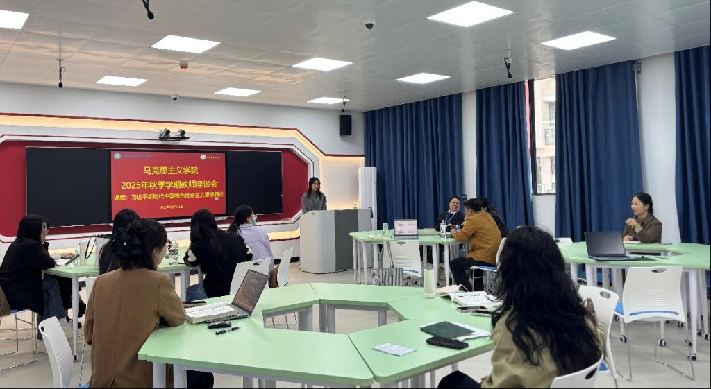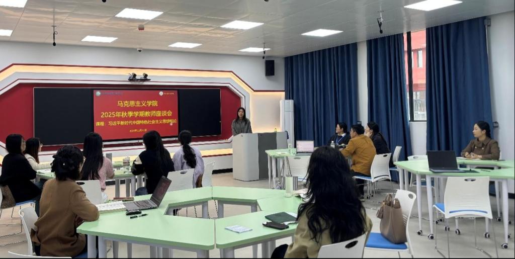 2025年11月11日,《习近平新时代中国特色社会主义思想概论》教研室在2号教学楼5楼智慧教室召开2025年秋季学期教师座谈会。马克思主义学院副院长潘秀忠出席会议,教研室全体授课教师参加会议。会议由教研室主任吴珊珊主持。