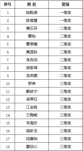 本次大赛我校共有66名学子报名参赛,经综合评定,校级选拔赛共评出一等奖2名、二等奖7名、三等奖9名、优秀奖15名,具体名单公布如下: