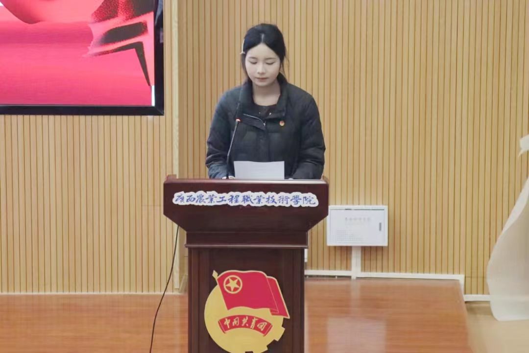 新团员代表蒋燕琳同学在会上发言,总结了自己过去的学习和生活表现,并表示今后会更加坚定理想信念、勤学苦练本领,践行团员初心和使命。